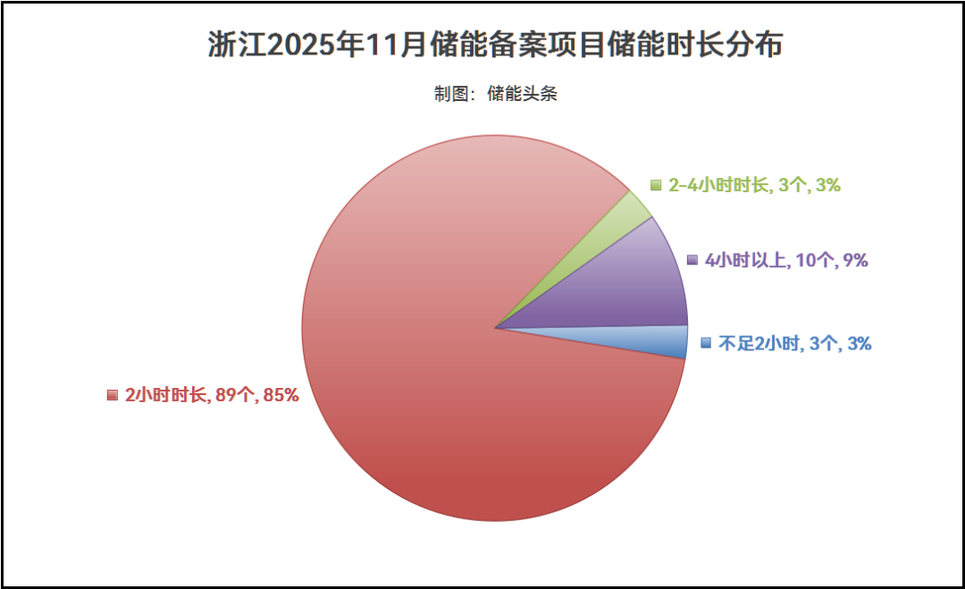 从备案项目的储能时长来看,据浙江省11月储能备案项目公开的信息得出,储能时长主要以2小时为主,其中时长2小时的储能项目占85%;2至4小时的储能项目占3%,时长在1至2小时的储能项目占3%;4小时以上的长时储能项目备案占9%。