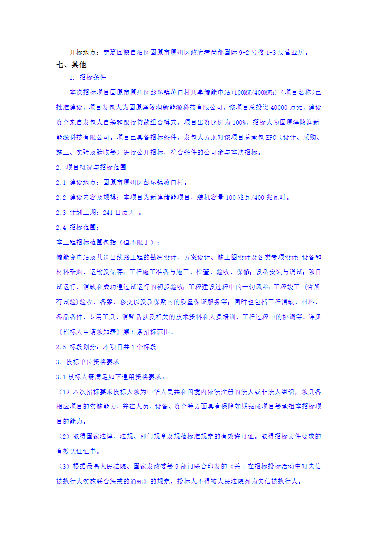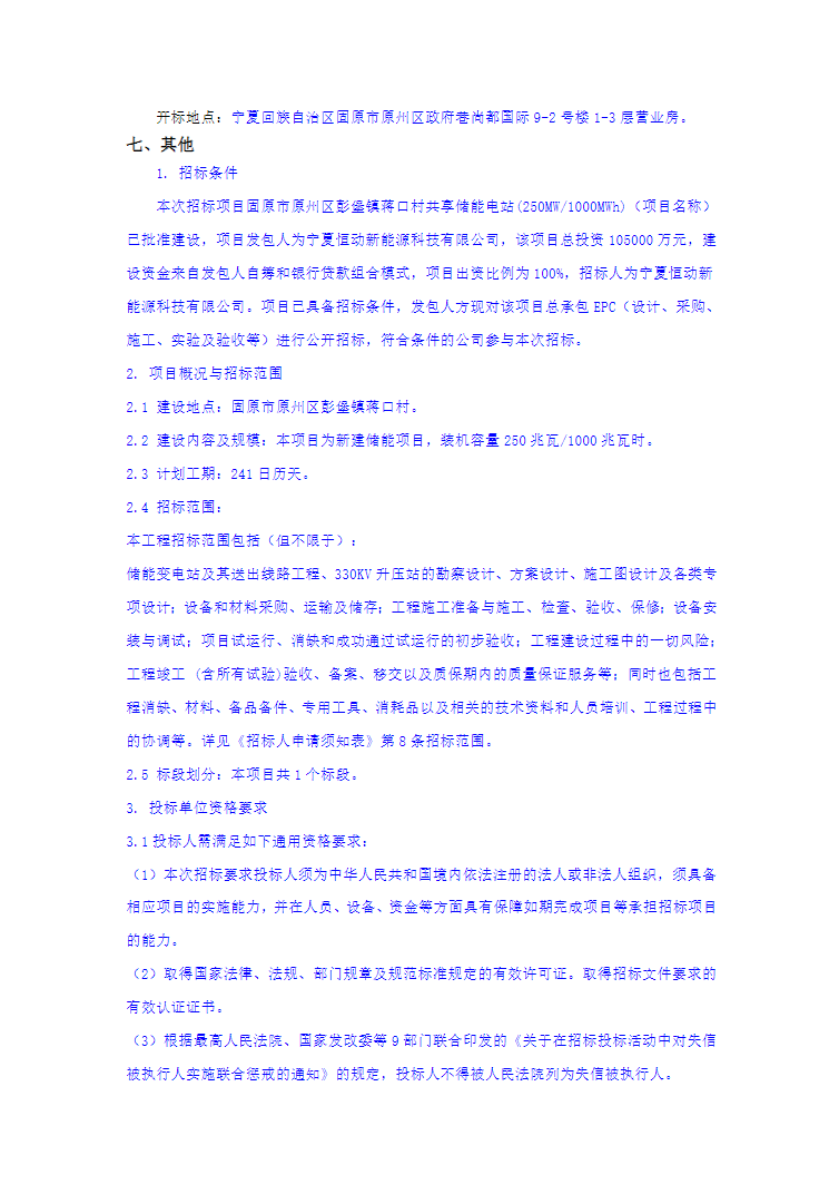 两个项目均位于宁夏固原市原州区彭堡镇蒋口村,为新建储能电站,计划工期均为241日历天。