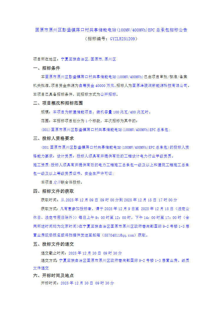 电力家获悉,12月9日,宁夏固原市原州区彭堡镇蒋口村两大共享储能电站EPC总承包项目同步启动招标,合计规模达350MW/1400MWh,总投资14.5亿元。
