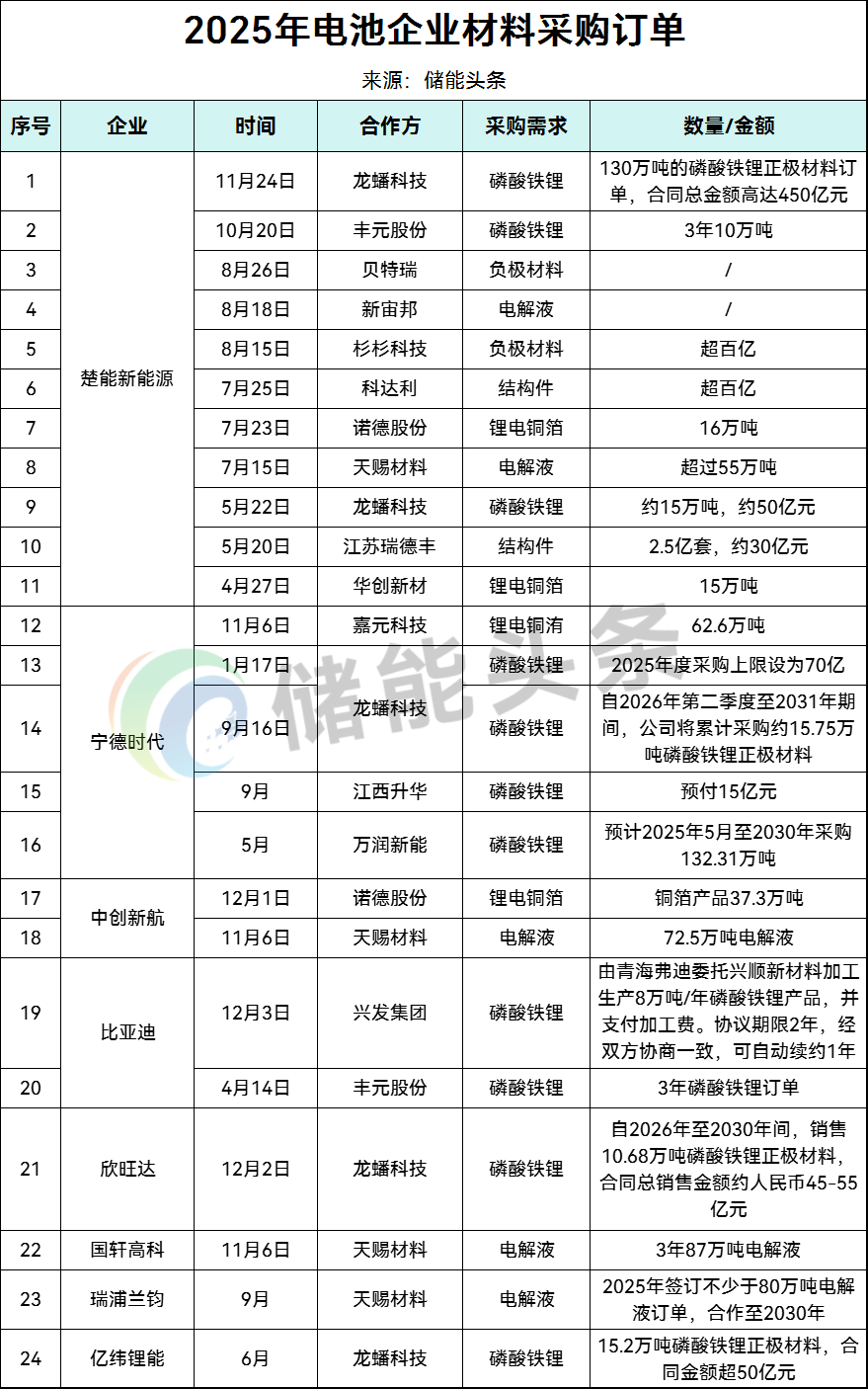 据电力家统计,2025年至今,包括宁德时代、亿纬锂能、国轩高科、中创新航、楚能新能源等一众电池企业纷纷向上游产业链“锁单”,涉及磷酸铁锂、负极材料、电解液、锂电铜箔、结构件等各个领域。
