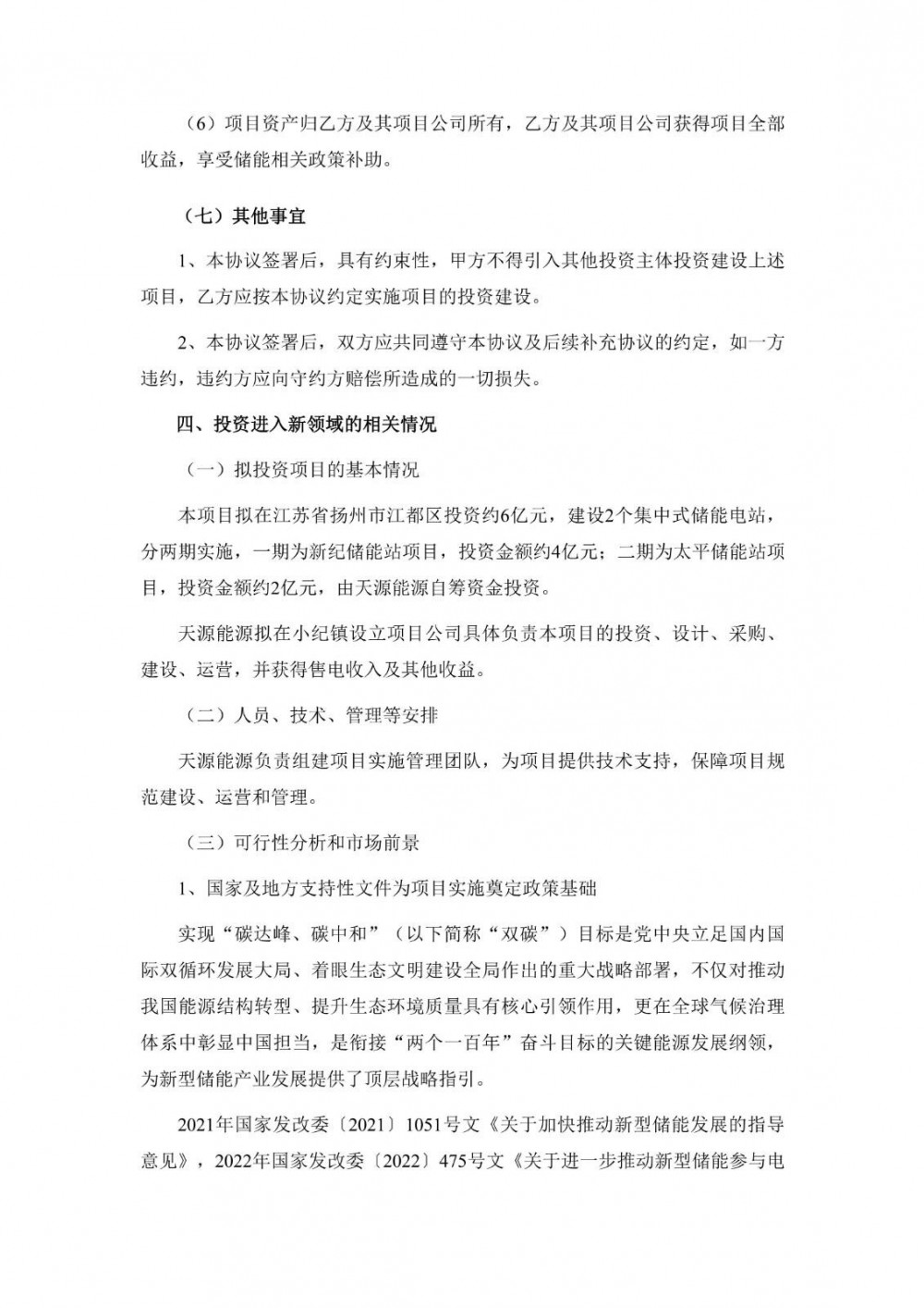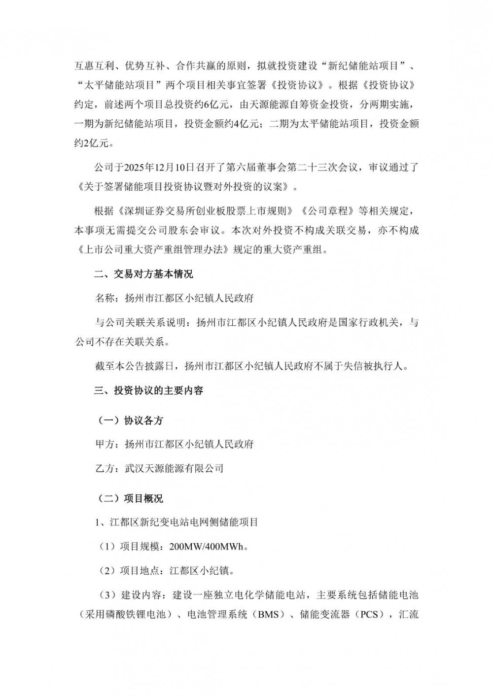 12月10日,武汉天源发布公告称,公司控股子公司武汉天源能源有限公司与扬州市江都区小纪镇人民政府拟就投资建设“江都区新纪变电站200MW/400MWh电网侧储能项目”、“太平变电站100MW/200MWh电网侧储能项目”签署《投资协议》,前述两个项目总投资约6亿元。