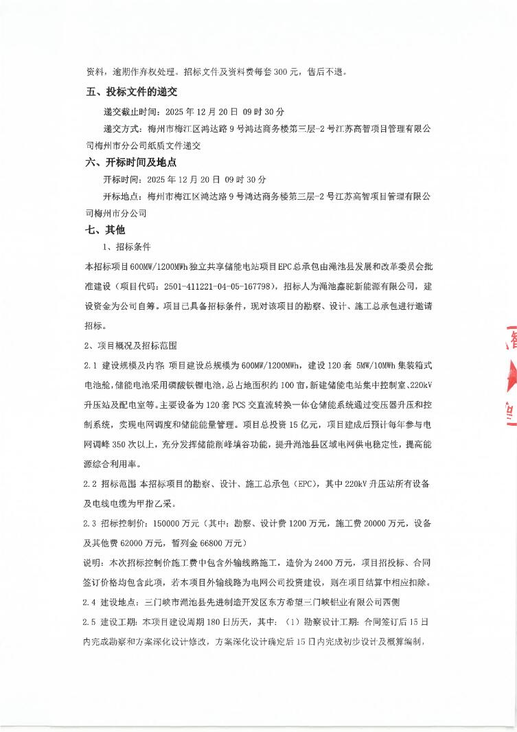 12月10日,600MW/1200MWh独立共享储能电站项目EPC总承包邀请招标公告发布。