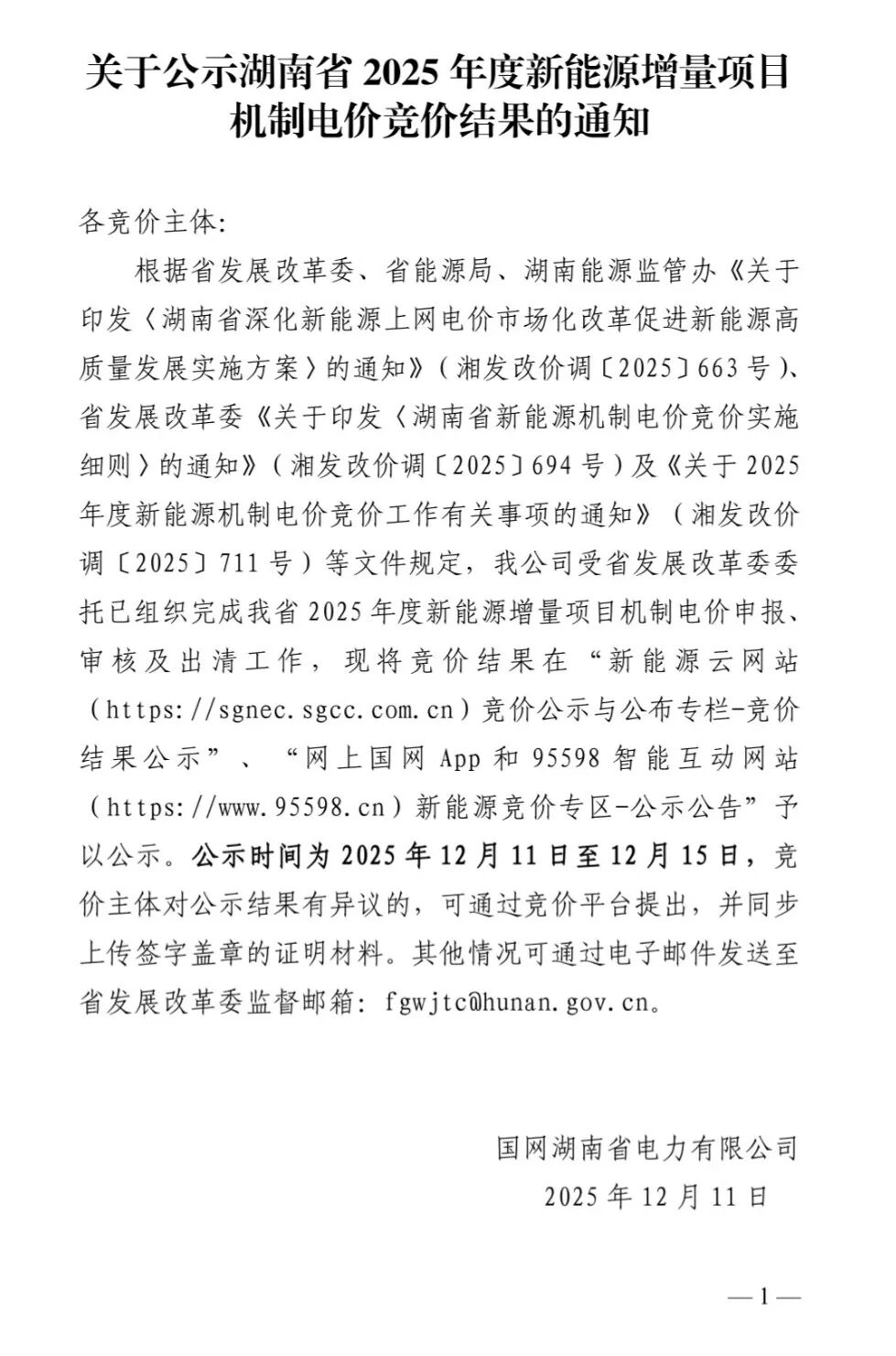 电力家获悉,12月11日,湖南省机制电价竞价结果公示,光伏机制电价为0.375元/度,风电机制电价为0.33元/度。
