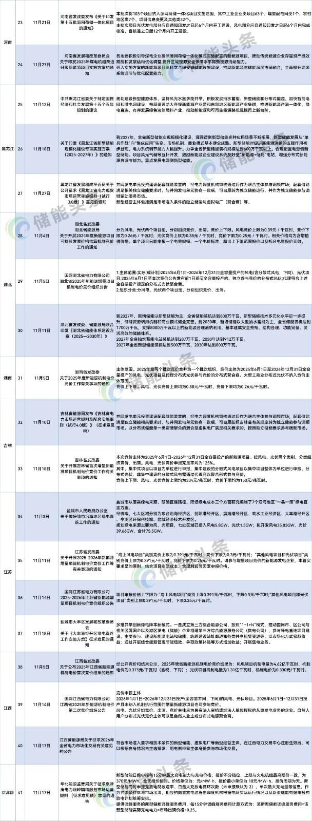 11月4日,湖北省发改委 湖北省能源局 关于开展2025年度新能源项目可持续发展价格结算机制竞价工作的通知,分为风电、光伏两个项目组,分别组织竞价、出清。竞价上下限。风电竞价上限为0.39元/千瓦时,竞价下限为0.26元/千瓦时;光伏竞价上限为0.38元/千瓦时,竞价下限为0.25元/千瓦时。相关价格均为含增值税价格。单个项目只能申报一个电量规模、一个电价标准,超出上下限范围报价以及拆分电量报价无效。