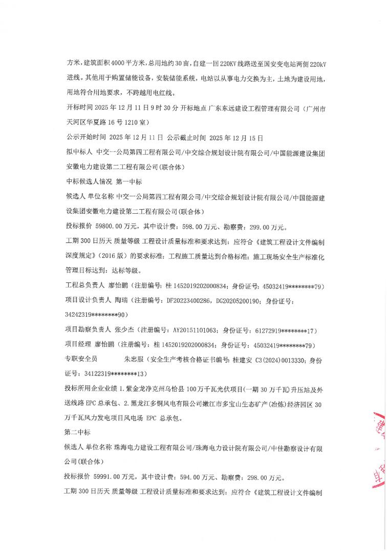第一中标候选人为中交一公局第四工程有限公司/中交综合规划设计院有限公司/中国能源建设集团安徽电力建设第二工程有限公司(联合体),投标报价59800万元,折合单价1.495元/Wh;