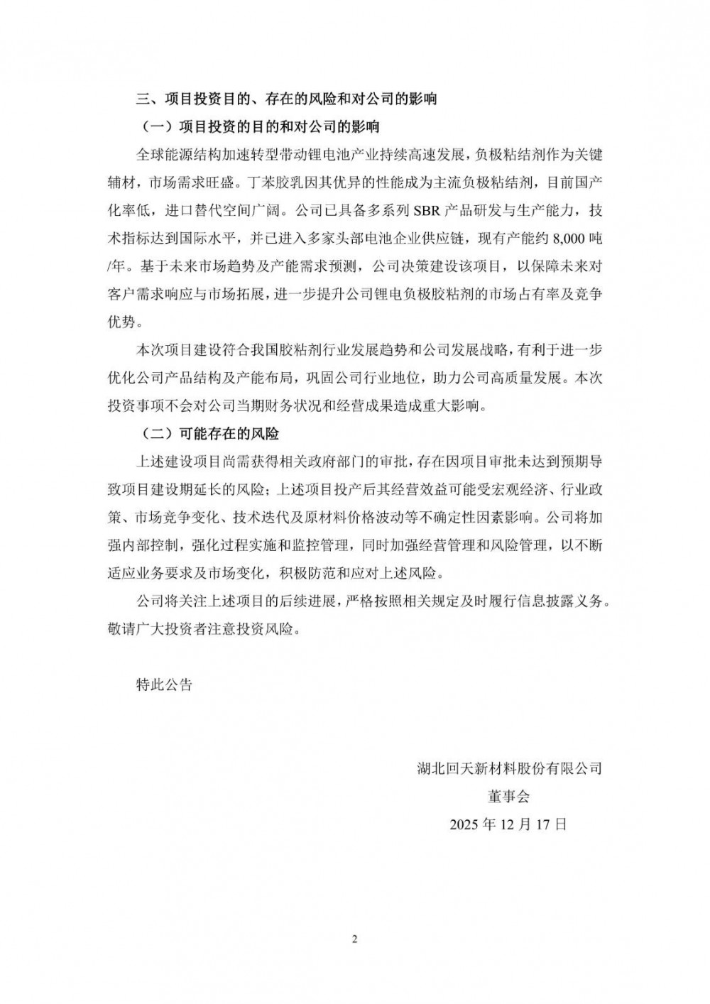 本次项目建设符合我国胶粘剂行业发展趋势和回天新材发展战略,有利于进一步优化公司产品结构及产能布局,巩固公司行业地位,助力公司高质量发展。本次投资事项不会对公司当期财务状况和经营成果造成重大影响。